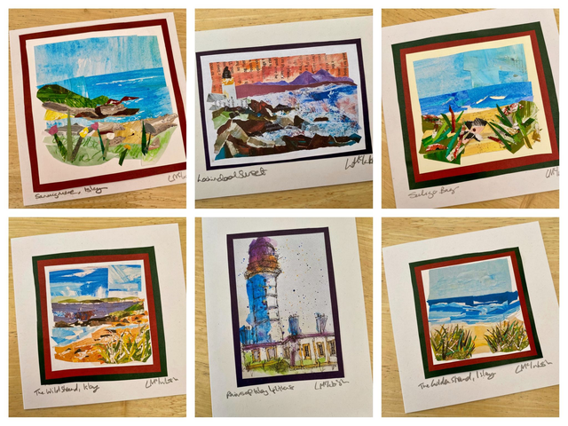 Islay Art Mix card pack - 6 x recycled cards & envelopes. 2 x original collage cards: Sanaigmore / Saligo 4 x printed cards: Loch Indaal Sunset / the Rhinns of Islay Lighthouse / the Wild Strand / the Golden Strand